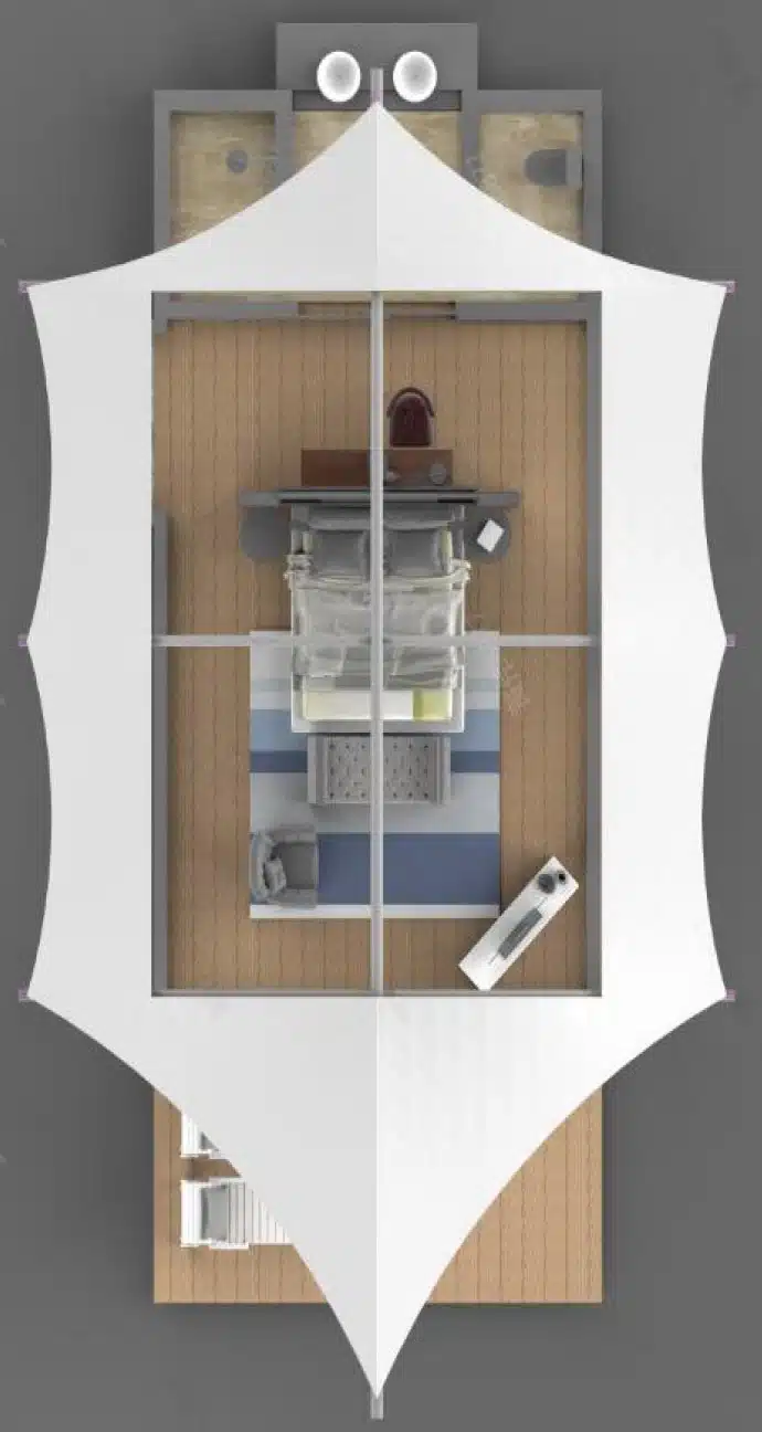 This extraordinary tent can be used as weekend home, beach resort hotel room, getaway home or a luxury resort villa floating on the ocean where you can directly dive into the clear blue water. The tent is build on a platform on the beach, ocean or on a hill and features outdoor deck for sunbathing or relaxing in the sun.